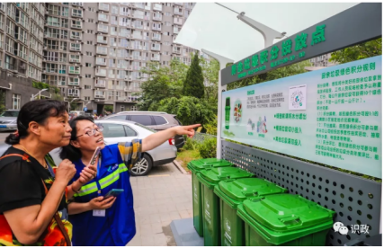 朝陽區(qū)白領(lǐng)家園小區(qū),志愿者指導居民分類投放垃圾